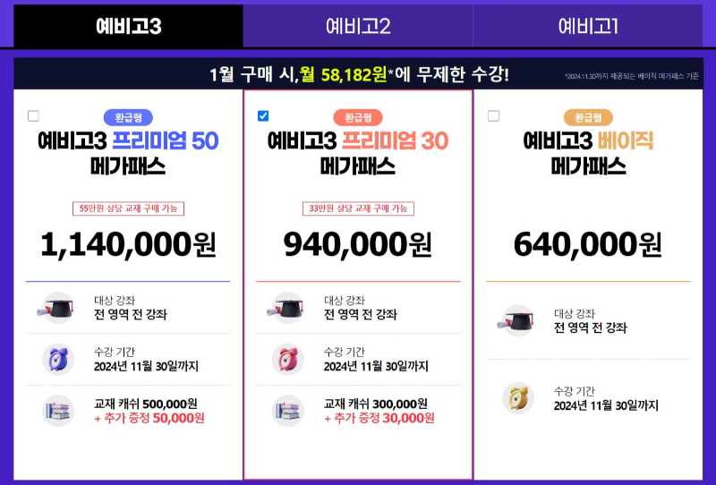 저희 아들은 고2때 메가패스를 이용하고 있어서 재결제 할인 혜택을 6만원 받았습니다. 메가패스 프리미엄 30은 원래 94만원인데 실제 결제한 금액은 88만원이예요~ ^^ 단, 재결제 할인은 기한이 12월 말까지여서 지금은 적용이 안되는 걸로 알고 있어요.