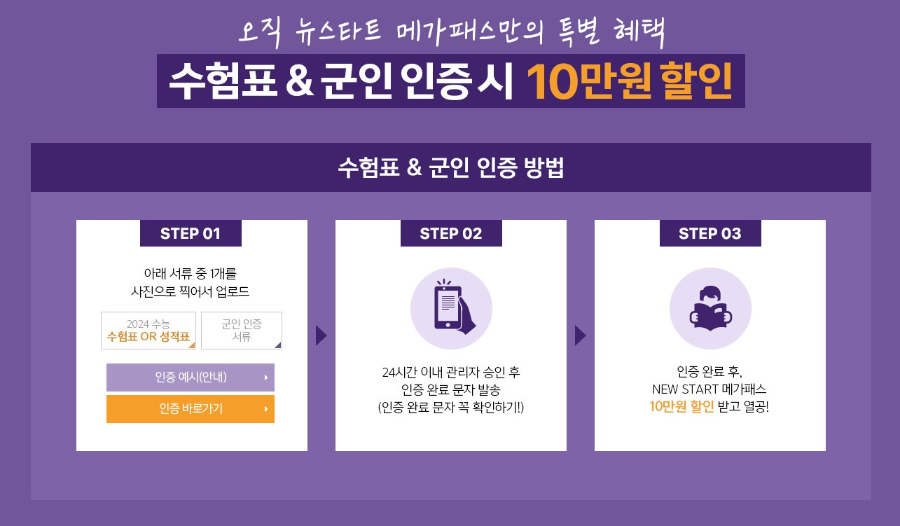 재도전을 응원하기 위한 할인 혜택으로 재수생을 비롯한 N수생은 수험표로, 군인은 서류를 제출하여 인증하면 10만원 할인 혜택을 받을 수 있습니다.