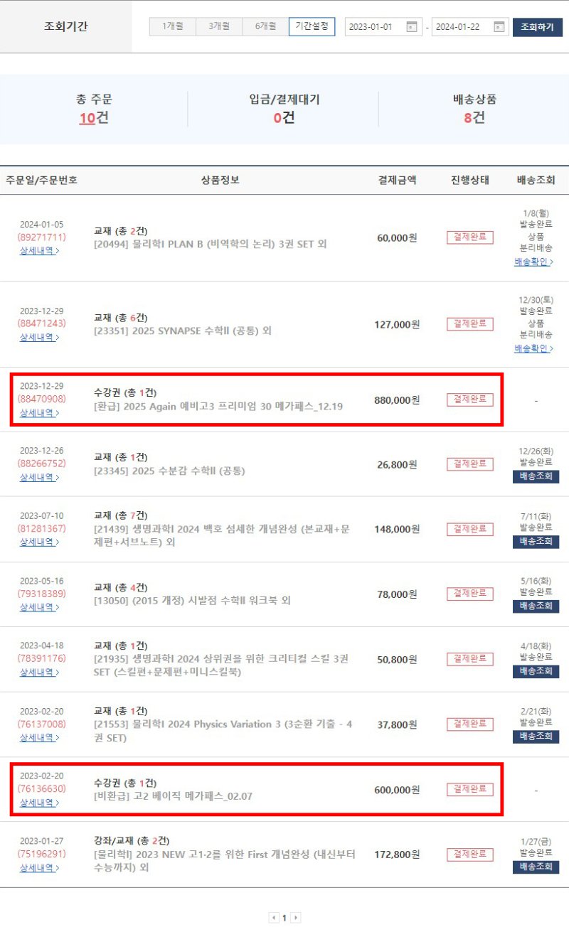 2학년 때에는 교재비가 없는 베이직으로 구매하였는데 아래 주문 내역 보시면 아시겠지만 1년이 지나 보니 교재를 30만원 가량 구입했더라고요.. 그래서 이번에는 교재비가 포함된 프리미엄 30으로 구매했습니다. 교재비 3만원을 추가로 더 받으니 이게 훨씬 나은 것 같아요. 프리미엄 50은 100만원이 넘어가니 살짝 부담이 되어서 30으로~ㅎㅎ