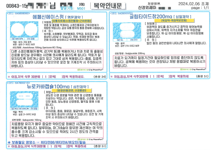 두 달 전 어깨와 팔의 통증으로 가까운 정형외과에서 엑스레이를 촬영한 결과 경추 5번과 6번 사이 목디스크가 좀 안 좋다며 소염·진통제를 처방받아서 먹었고, 두 달 여 동안 체외충격파 치료, 도수 치료를 받았습니다. 그리고 종합병원 신경외과에서 MRI 촬영 및 신경차단주사 치료를 받았고, 신경통증약을 추가로 처방해 줘서 지금도 계속해서 먹고 있습니다.