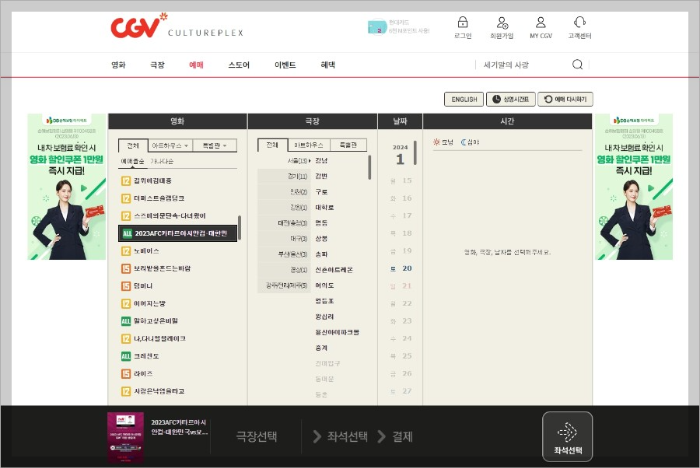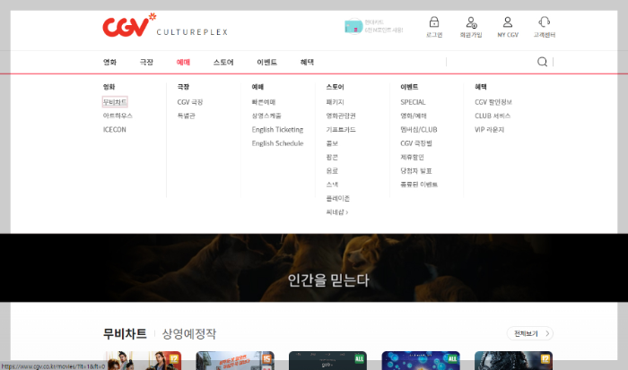 CGV 홈페이지 상단 '예매' 메뉴의 '빠른 예매'를 클릭하면 영화 포스터가 나열되어 있는 무비차트 페이지와 영화정보 페이지를 생략하고 바로 영화와 극장을 선택할 수 있는 예매 페이지로 이동합니다.
