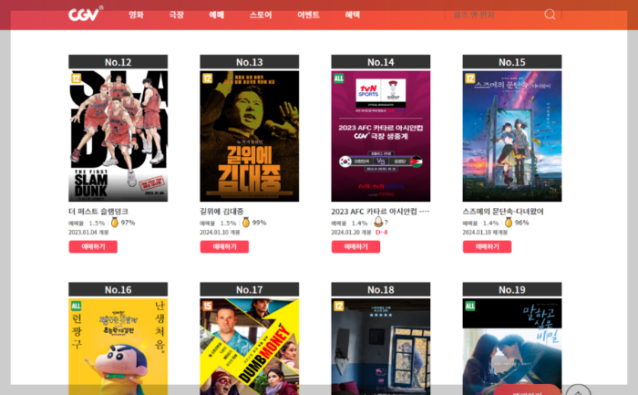 보다 큰 화면으로 한국 축구 경기를 관람하면서 우리 선수들을 함께 응원하길 원하시는 분들을 위해 CGV 극장 생중계 소식을 전해드립니다. 결론부터 말하자면, 예매 방법은 일반 영화 예매 방법과 동일합니다. 쉽죠? :) 다만, 조별 리그 경기가 각각 다른 영화로 게시되어 있으니 경기가 열리는 1월 15일(월), 20일(토), 25일(목) 해당 날짜별로 영화 개봉일을 선택하시면 됩니다. 15일 바레인 전은 경기가 종료되어 예매가 불가하고, 16일 현재 기준으로 20일 요르단 전과 25일 말레이시아 전은 예매가 가능한 상태입니다. 그럼, 예매 방법을 자세히 알아보도록 하겠습니다.